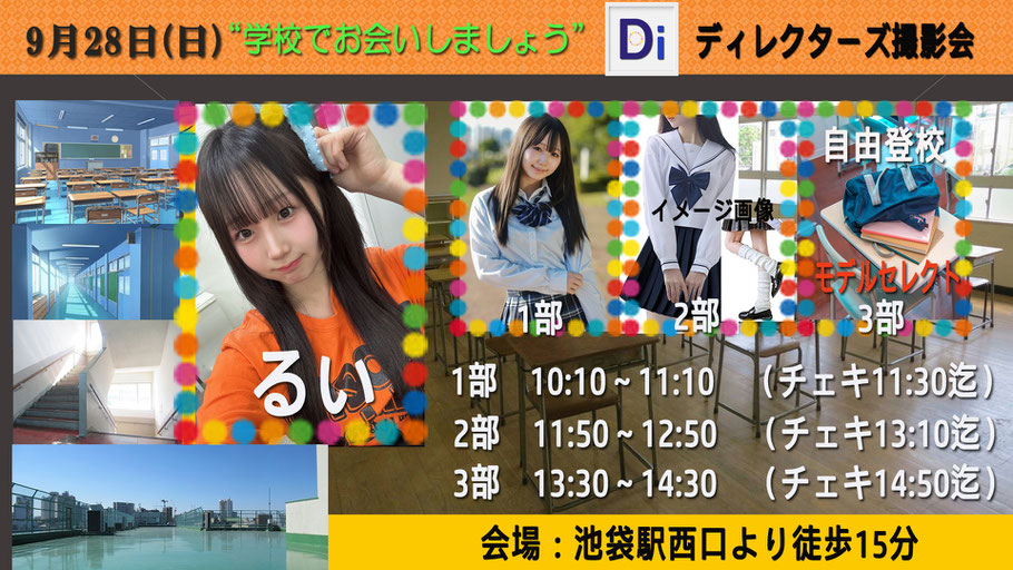 9/28(日)開催, アイドルモデル、人気コスプレイヤーによる学校セッション撮影会です。各部参加定員数は3密回避に留意します。全員合同1部から3部のセッション開催です。各モデル列に自由にお並び頂けます。カウントダウンによる順番撮影です。撮影形式は演者毎に、囲み撮影もしくは前列,後列数名に分かれての交互列撮影、もしくは順番メイン交代撮影(脇撮り可)です。スペースによって囲み撮影、一定距離保っての交互列順番撮影の予定です。参加価格は各部8,000円(税込)です。 御予約の際アンケート欄に推しモデル名各部①名記載願います、演者モデルさんに推し参加お伝えします。連絡事項欄にSNSX- IDとXネーム記載も宜しくおねがいします。各部チェキオプションは終了5分前開始とし、チェキ撮影時間は終了後20分以内迄とさせていただきます。各部開始時は推し列に集合ください、各演者よりご挨拶させていただきます。